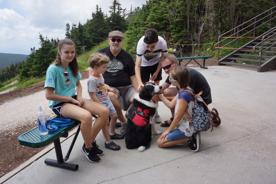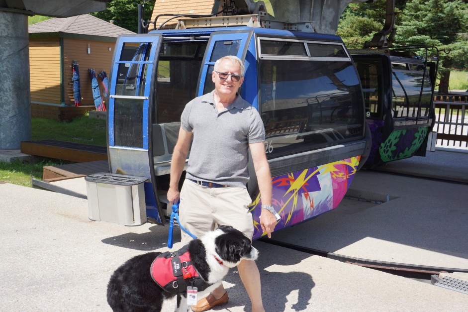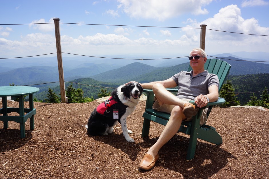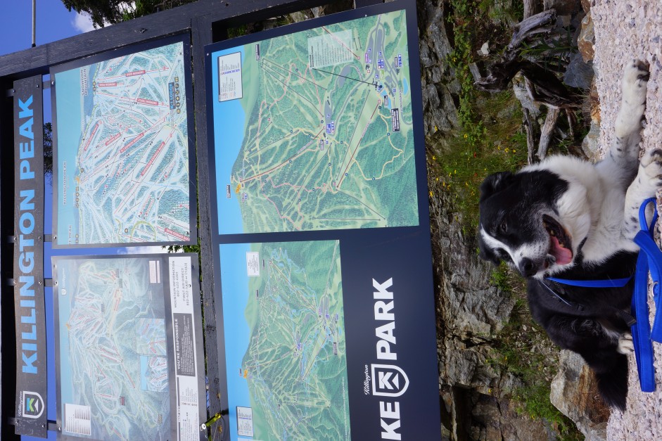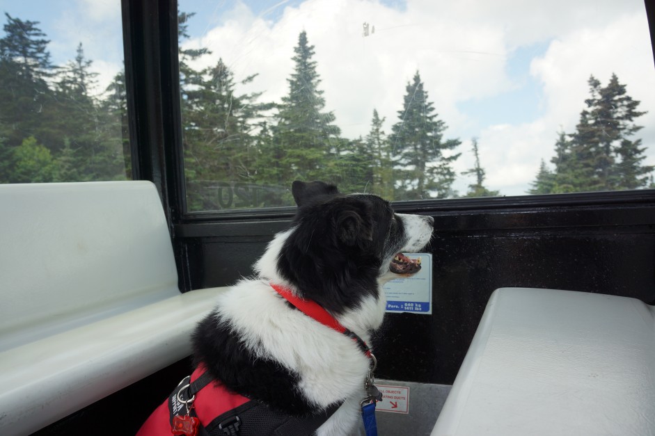 Yesterday I decided I would take Ben to the top of the mountain to show him where I had ridden so often with his predecessor. With his bad hip Ben is in no shape to run up the mountain beside my bike, come to that I am not currently in good enough condition to pedal up anyway. Killington runs its main gondola lift year round so we headed for the base lodge and after explaining that he is a registered service dog I was allowed to buy a lift ticket. It is not every day that one sees a dog on a ski lift but I was pretty sure he would take it in stride. He did, of course. Jumped into the little cabin and settled down to watch the view with interest.