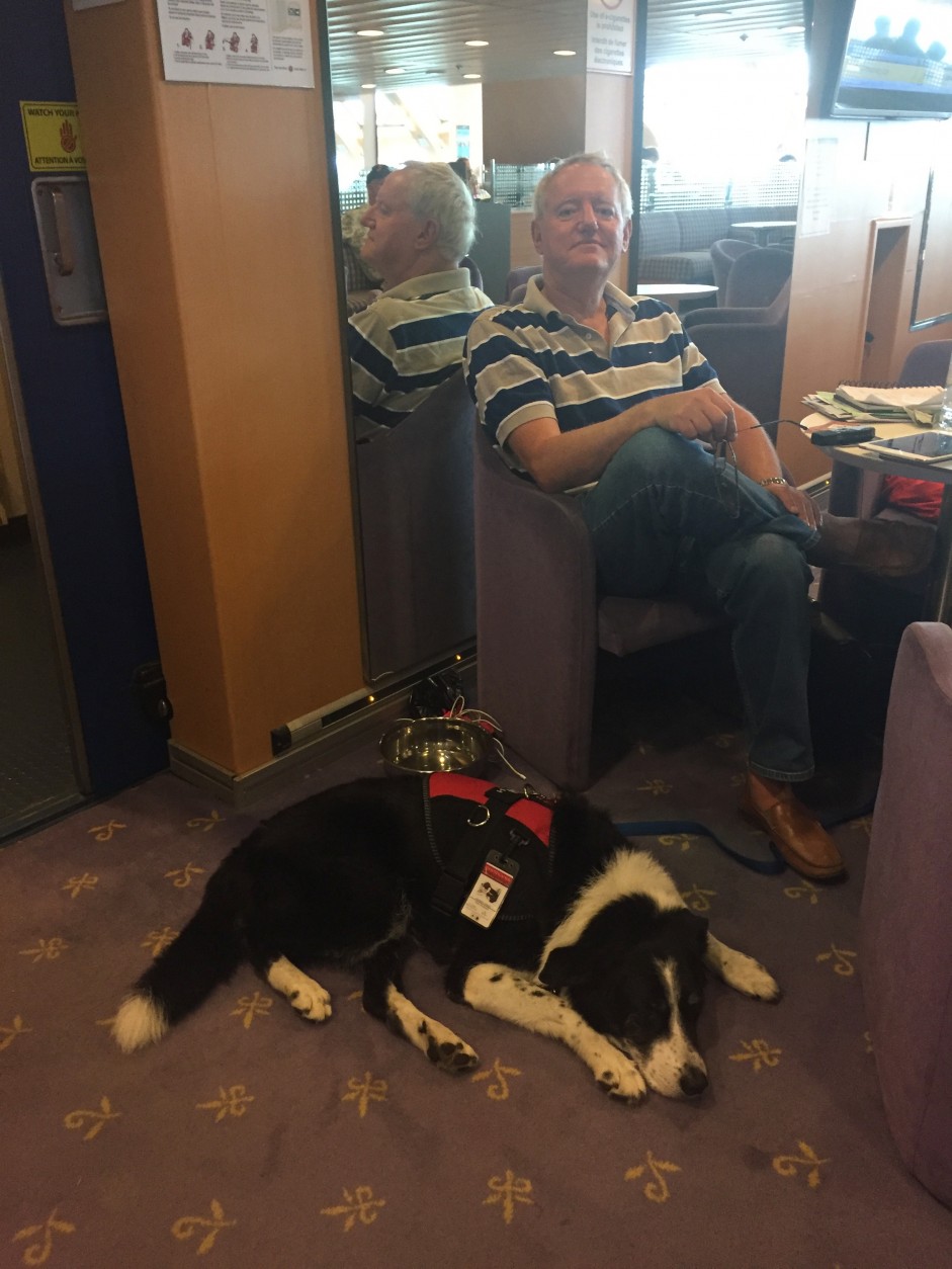 The ferry sailing on Thursday afternoon was uneventful, we boarded and had a crew member show us to an elevator as Ben would not have made the steep stairs nor the escalator. We chose a quiet corner in one of the lounges and he slept the entire way across save for the occasional petting from passers by. Unfortunately visibility remained poor so no photos from the part of our trip apart from one inside shot.